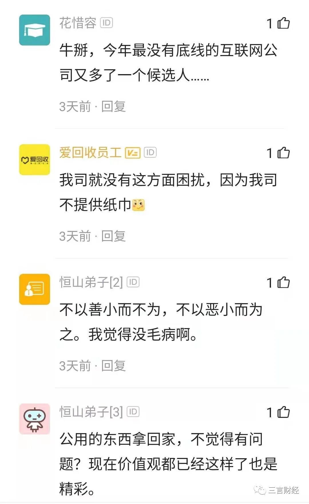 也有部分人认为,“不以善小而不为,不以恶小而为之”,公司公用物品是提供给大家用的,并不是私人的物品,“今天可以拿纸巾,明天就能可以偷数据”。