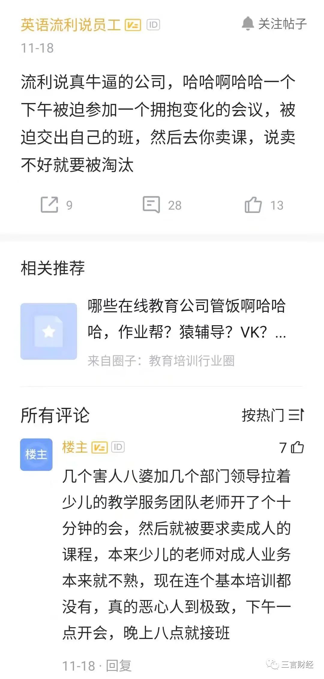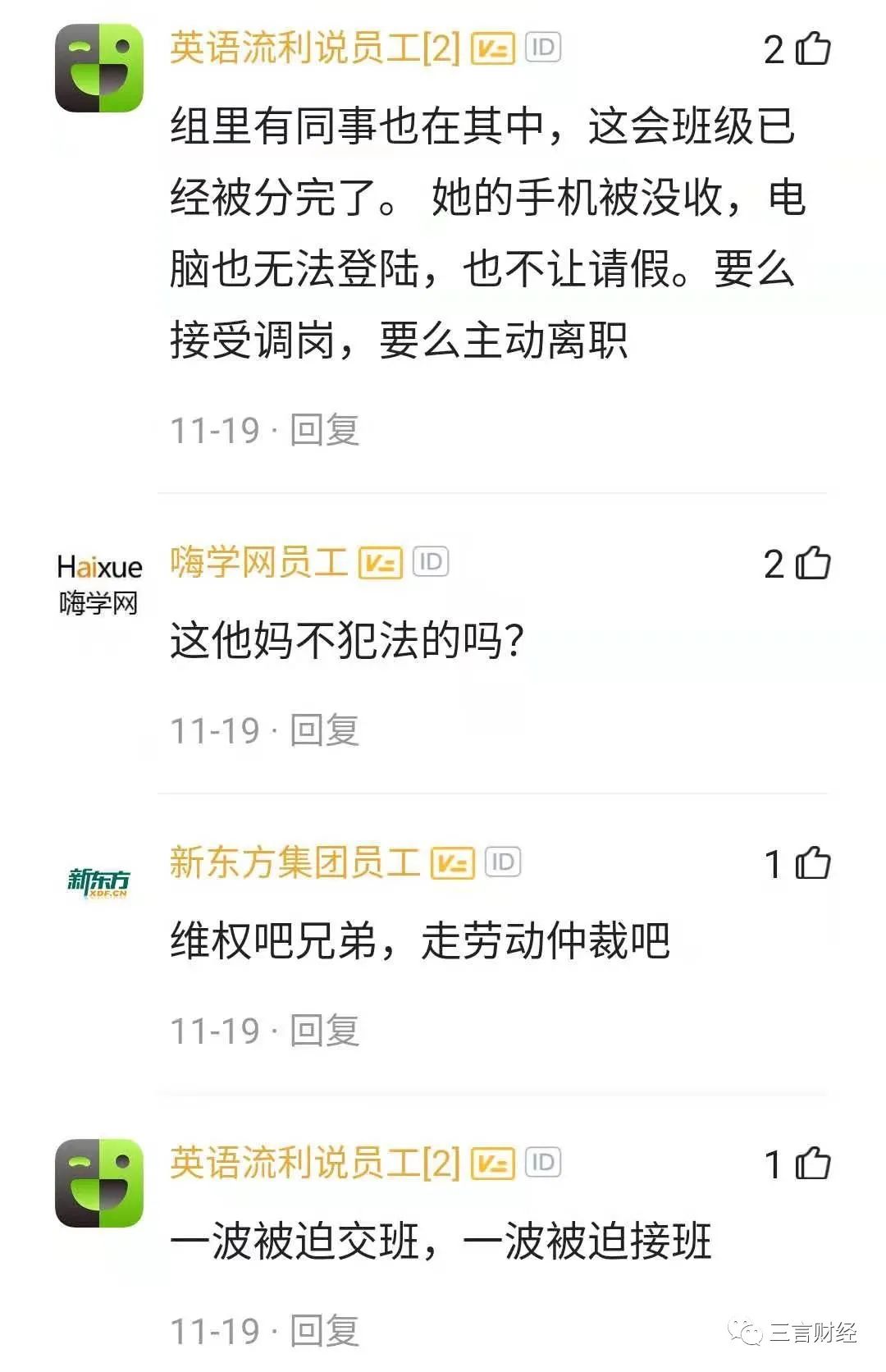 在这条爆料下,另一名流利说员工表示,他组里也有同事在其中,班级已经被分完,手机被没收,电脑无法登陆,也不让请假,“要么接受调岗,要么主动离职”。