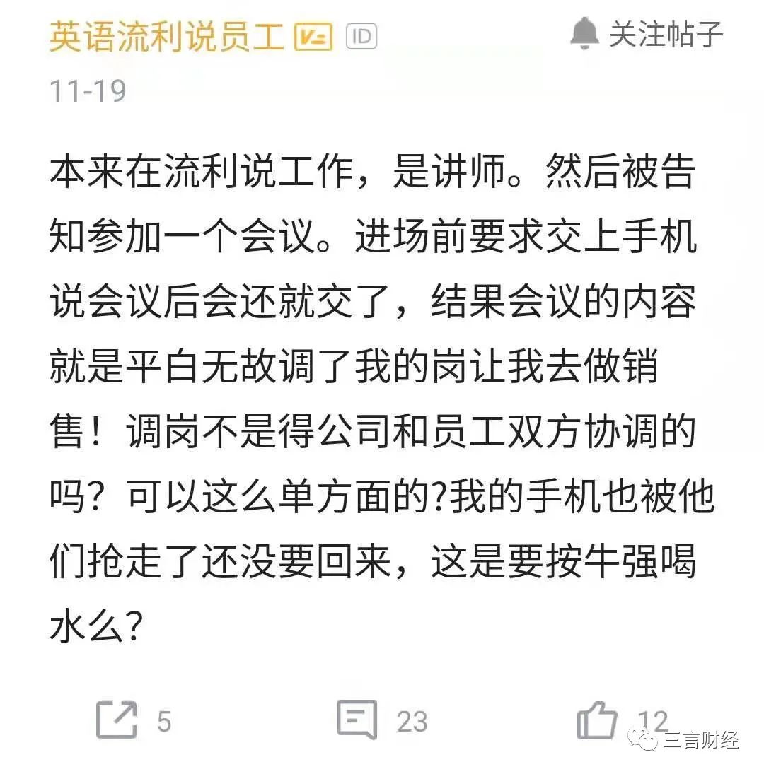 此外,有流利说员工谈到自己被“强制调岗”的经历。该员工表示,本来自己是讲师,但被安排参加一个会议,进场前手机被没收,结果会议的内容就是调岗,从讲师变为销售。他强调是公司单方面调岗,没有协调,手机被拿走了也没要回来。