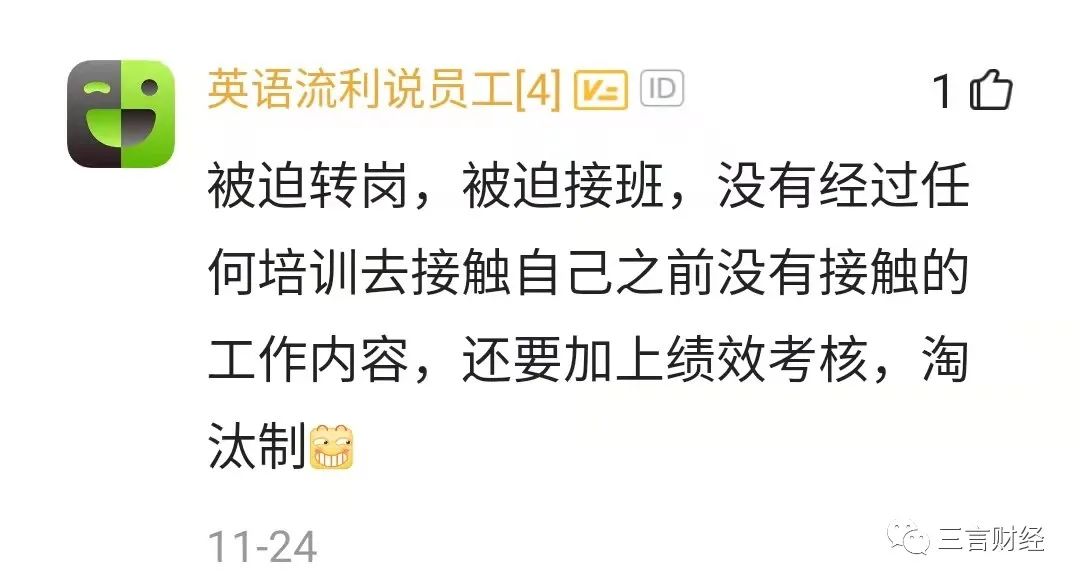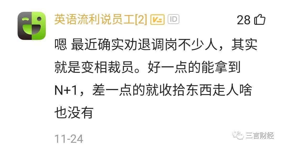 有英语流利说员工回复称,近期劝退调岗不少人,实为变相裁员;好一点的能拿N+1赔偿,差一点的啥也没有。
