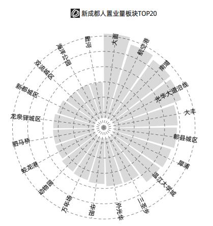 从置业人群TOP20板块来看,前四板块置业人数明显比其他板块高,前四板块为“光大”(光华大道沿线、大面)及“南航”(南湖、航空港),已非传统认知中的“大中华”(大源、中和、华阳)。