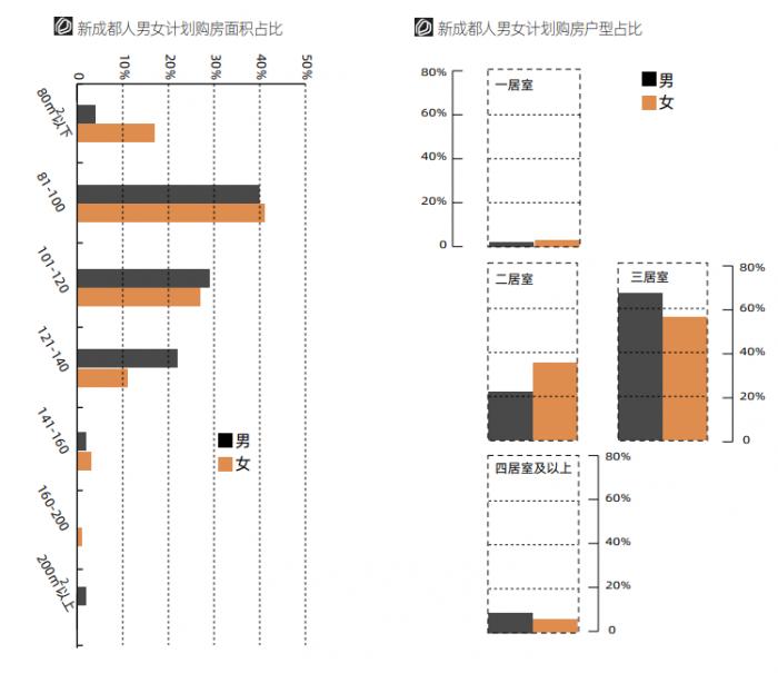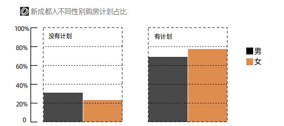 新成都人女性购房意愿度更强。根据对新成都人购房需求进行调查发现,女性有购房计划的占77%,男性有购房计划的为69%,相比男性,新成都人女性购房意愿度更强。
