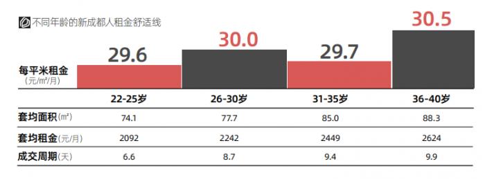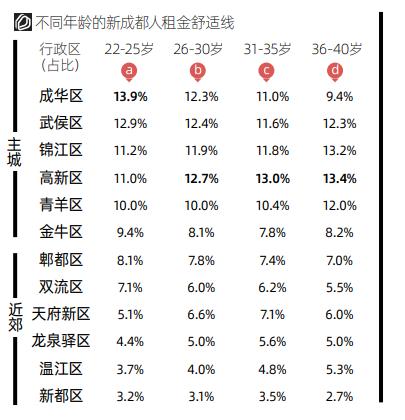 新成都人租房舒适线:租金单价30元/㎡·月,套均可承受租金在2500元以下。根据贝壳研究院发布的《新一线城市居住生活报告》,成都房租收入比在15个新一线城市中排名第9,“蓉漂”负担相对较小,各年龄段新成都人的租房均价基本趋近于30元/㎡·月。据调查显示,92.1%的新成都人可承受的租金水平在2500元以下。