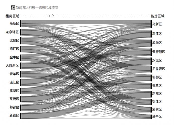 新成都人更愿意在租房的区域就近购房。出于工作地点和生活习惯方面的考虑,新成都人更愿意在租房的区域就近购房,从主城和近郊区域观察,新成都人购房时,在原区域购房的占比非常高,同一区域的房屋具有绝对的竞争力。黏性最强的分别为温江区、双流区、新都区,同区域购房占比约65%。