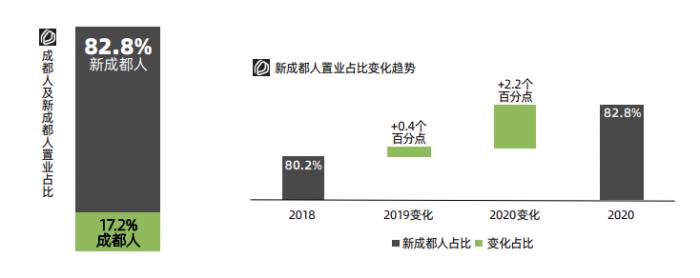 新成都人占成都置业人群的83%,且置业占比加速提升。据贝壳找房2020年的成交数据显示,选择在成都置业的人中83%为非成都户籍,也就是我们前面定义的新成都人。并且对近3年数据进行观察发现,新成都人置业占比近两年均有上涨,且呈加速提升态势。