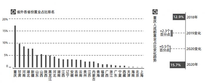 省外占比保持韧性,成渝‘双城记’推动来蓉置业需求。从省外置业人群来看,19年省外置业占比降至20%,20年保持这一比例不变,主要还是由于19年省内人口流入加速引起,而20年能在同样情况下保持,也体现省外置业人群的韧性。同时我们从各省市的排名情况来看,排名前三的省市分别为重庆市(15.7%)、甘肃省(8.9%)、河南省(7.8%),其中重庆及甘肃近两年均在连续提升。