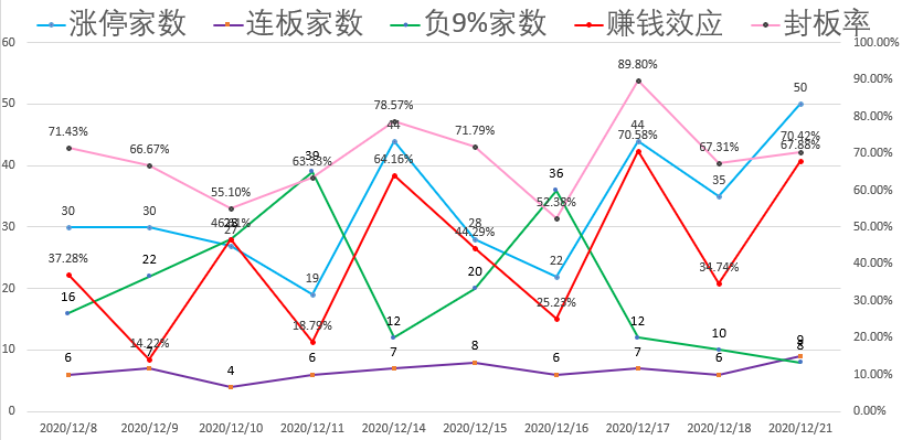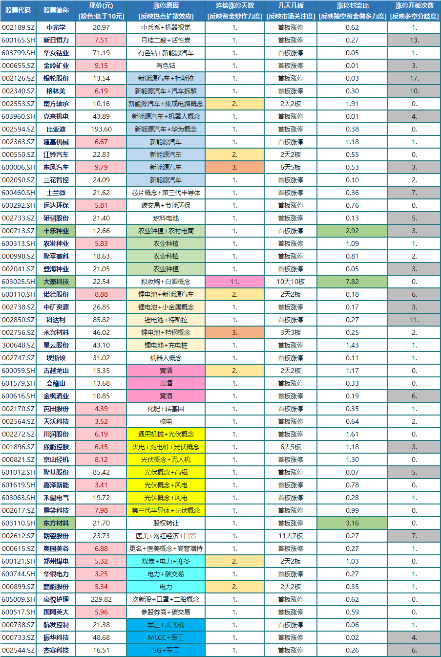 总涨停家数(#去除科创板、新股、ST):50家(日增15家),增速同步大盘,明日调整概率大;连续涨停家数【资金追高情绪】:9家(日增3家),指标跳空新高,追高风偏上佳;最火热板块【大涨股最多】:新能源车(宁德时代大涨创新高);资金强做多【明日谨慎回避】:丰乐种业(农业种植);高位大跳水【多空情绪急转】:思进智能(开板新股);