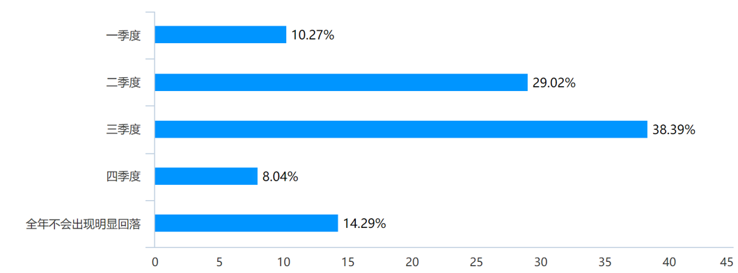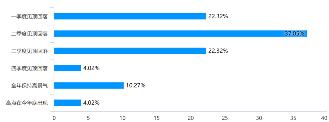 多数受访者认为明年出口会出现环比回落,但对环比回落的时间产生分歧。38.39%的受访者认为三季度回落,29.02%认为二季度回落,10.27%认为一季度回落,8.04%认为四季度回落,还有14.29%认为全年不会出现明显回落。