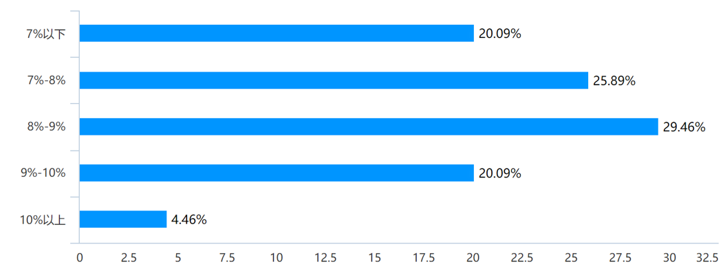 受访者对明年中国GDP增速预期基本以8%-9%为中心向两边递减分布:29.46%受访者认为增速在8%-9%,25.89%认为增速在7%-8%,20.09%认为增速在7%以下,20.09%认为增速会在9%-10%,4.46%认为增速在10%以上。