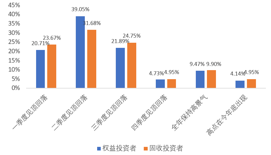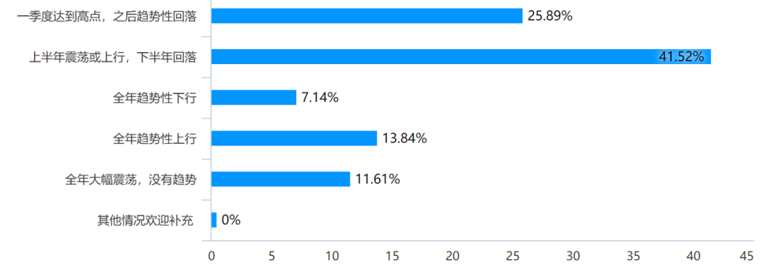 对于明年利率走势,超四成受访者认为明年上半年利率震荡或上行,下半年回落。四分之一受访者认为利率会在一季度达到高点之后开始回落。认为利率趋势性上行、趋势性下行或没有趋势的受访者占少数。