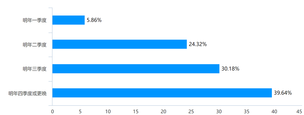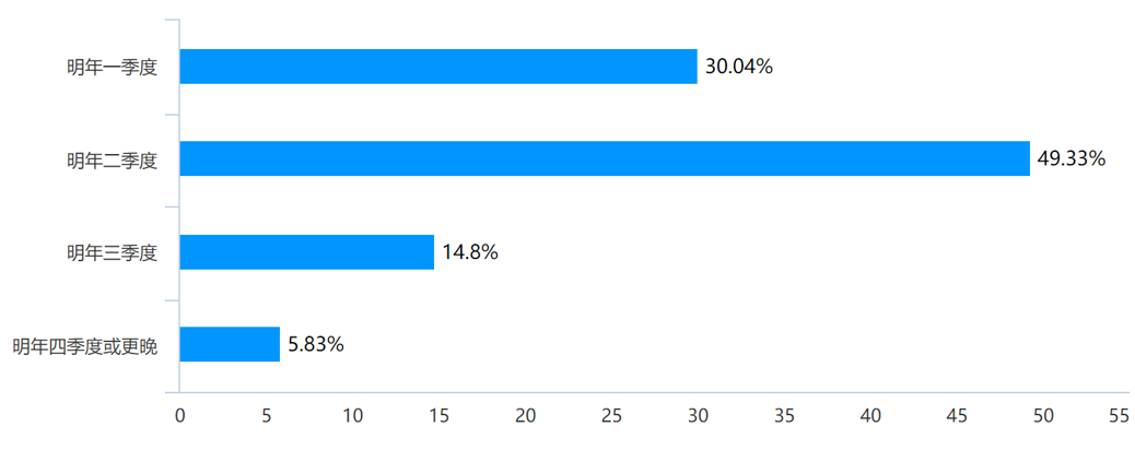 认为可能降准的受访者,对于降准的时间预期存在分歧。虽然往年年初降准的概率较大,但当前货币政策态度下,仅两成受访者认为降准会发生在一季度,多数受访者认为降准可能的时点发生在明年二季度或三季度的概率更高。