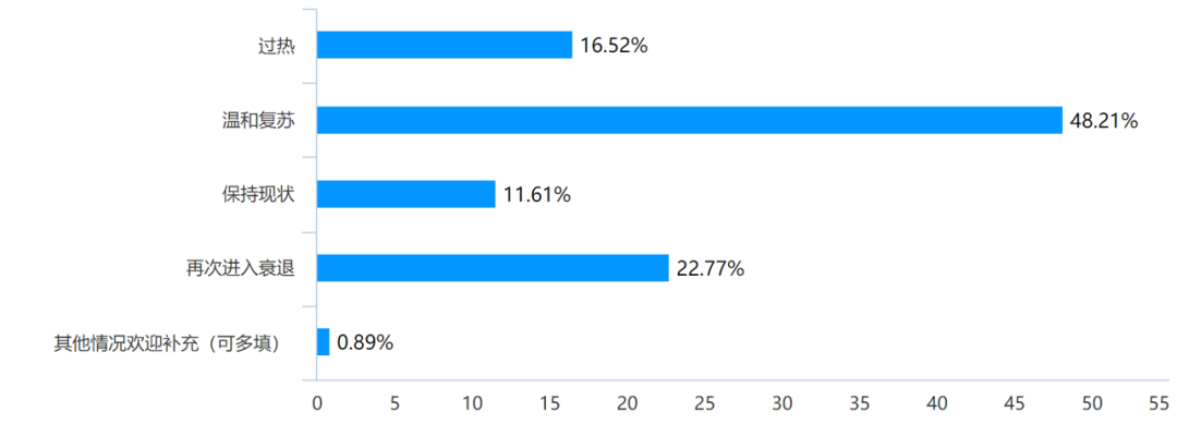 受访者对明年疫情控制后的美国经济走势产生分歧:48.21%认为会温和复苏,22.77%认为会再次进入衰退,16.52%认为会过热,11.61%认为会保持现状。