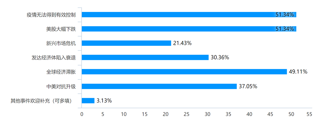 受访者最担心的全球风险是疫情无法得到有效控制、美股大幅下跌、全球经济疫后陷入滞涨。另有超三成担心中美对抗升级和发达经济体陷入衰退,两成担心新兴市场危机。