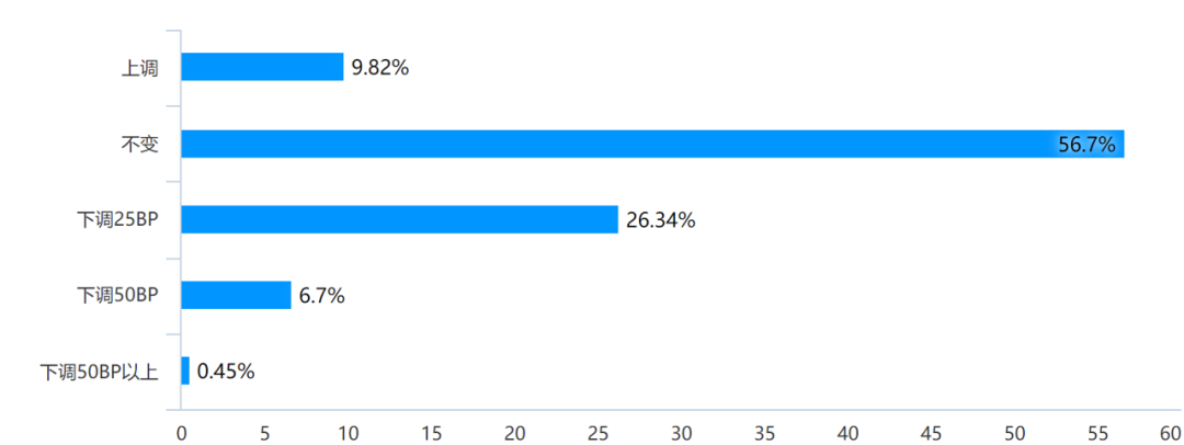 多数受访者认为明年不会降准。也有不到三成26.34%认为明年可能降准25bp。