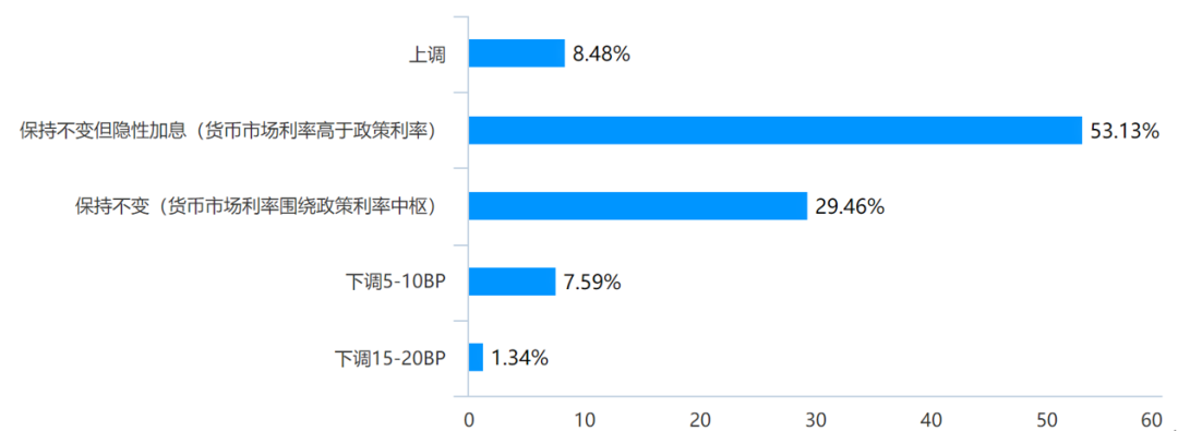 多数受访者预期明年不会加息。超五成预期明年MLF利率保持不变但会隐性加息(比如减少投放量,结果是货币市场利率高于政策利率),近三成预期明年MLF保持不变(货币市场利率围绕政策利率中枢)。预期直接加息或降息的受访者占少数。