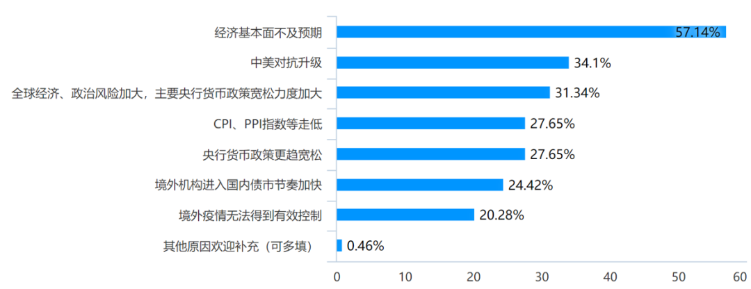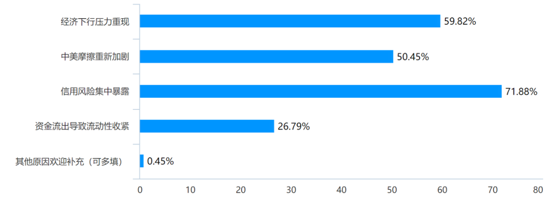 多数受访者认为可能导致明年政策重新放松的主要原因来自于信用风险和经济下行压力。另有约五成认为政策放松可能来自于中美摩擦重新加剧。