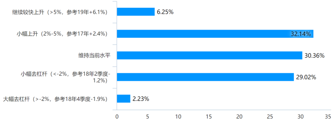 受访者对于明年宏观杠杆率的变化预期存在较大分歧:认为明年宏观杠杆率维持当前水平、小幅上升、小幅去杠杆的均占三成左右,仅极少数认为会大幅去杠杆。
