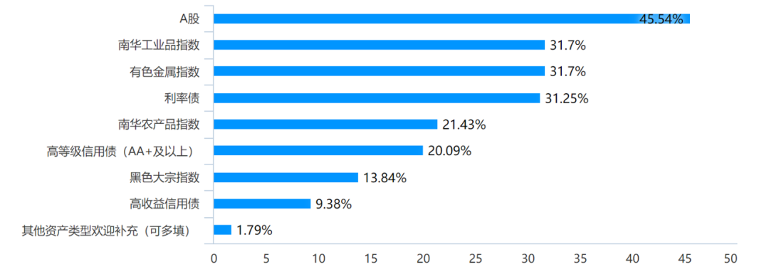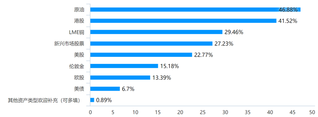 海外资产中,受访者最看好今年表现不佳的原油和港股。近三成受访者看好铜、新兴市场股票。看好美股的占比略超两成。黄金、欧股、美债相对不被看好。