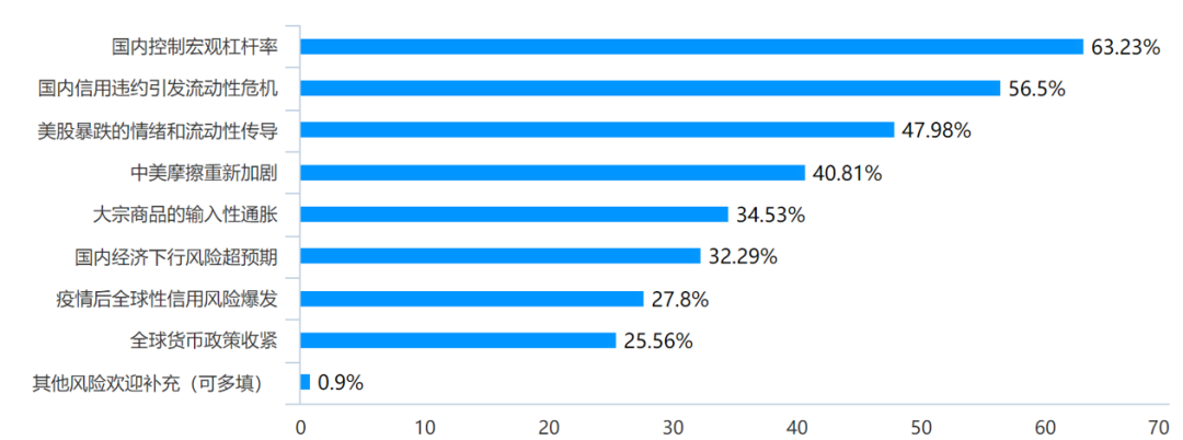 超六成受访者认为工业品价格及原油共振,输入性通胀压力加大是推动明年利率上行的主要风险,紧随其后的因素是经济基本面反弹超预期和和央行货币政策收紧,分别占受访者的55.2%和52.94%。