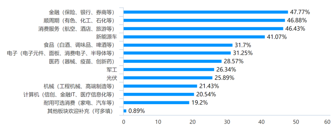 受访者对于明年看好板块的预期相对集中,近一半受访者最看好金融、顺周期和消费服务,超四成受访者最看好新能源车,超三成受访者看好食品和电子。