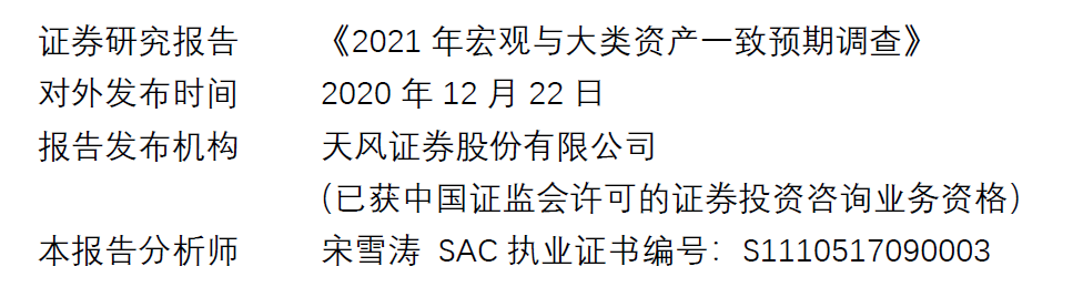 一致预期是否有用?从以往经验来看,市场对于宏观经济的一致预期通常在预测逻辑上比较准确,预测结果出现较大偏差的原因往往是路径上出现了未知的外生性变量,例如2020年的新冠疫情。但市场对于资产表现的一致预期的预测准确率就比较低。这里面有两方面原因:一方面,市场的一致预期存在较强的线性外推倾向,往往倾向于认为当年年底表现较好的资产和板块来年还会保持较强的惯性,过于重视当前政策和热点的短期影响。另一方面,市场具有自我实现的特征,一致预期出现的时候基本也是一致预期正在定价的时候,因此影响市场边际定价的因素往往在一致预期之外甚至是反面,比如贸易战、去杠杆、无限量量化宽松等。对市场还是需要用动态的、迭代进化的眼光来观察、理解和应对。