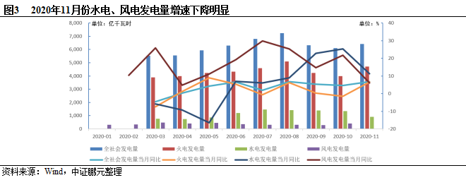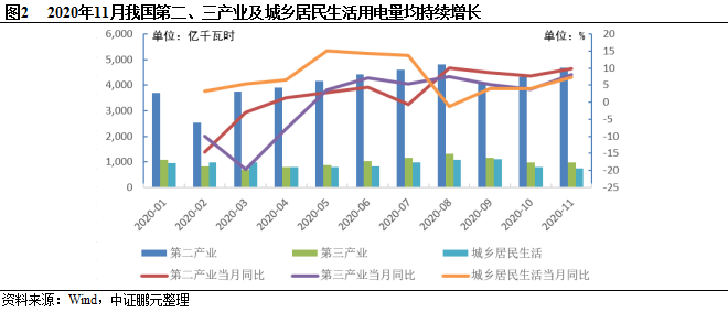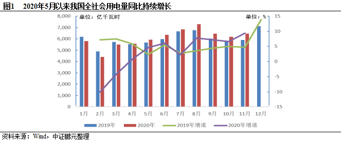 得益于我国疫情防控和复工复产取得进展,国民经济稳步复苏,全社会用电量快速增长。根据中电联数据,2020年1-11月,全国全社会用电量66,772亿千瓦时,同比增长2.5%,其中,11月份全社会用电量6,467亿千瓦时,同比增长9.4%,创年内新高,预计12月全社会用电量仍将继续保持较快增长。