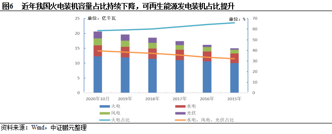 近年我国可再生能源发电装机容量占比提升,但受冬季枯水期、来风、光照等自然条件影响,水电、风电和光伏发电的调峰能力较差,对电力系统调峰压力增加,当由于气象等原因,新能源发电停止出力时,要求电力系统能够快速响应,否则就容易出现电力供应不足的情形。截至2020年10月底,全国发电装机容量21.0亿千瓦,同比增长6.3%,其中火电12.3亿千瓦,同比增长3.9%,占全国发电装机容量的比重为58.57%,较2015年末下降了7.33个百分点;水电、风电和光伏装机容量分别为3.7亿千瓦、2.3亿千瓦和2.3亿千瓦,同比增长2.9%、15.3%和18.8%,合计占全国发电装机容量占比达39.52%,较2015年末提升7.26个百分点。
