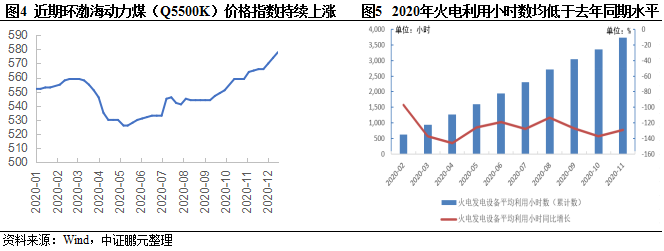 近期煤价持续走高,叠加环保因素影响,火电经营压力加大,一定程度压制火电厂发电意愿。2020年下半年开始环渤海动力煤(Q5500K)综合平均价格指数持续上涨,12月更是突破了国家发改委《关于平抑煤炭市场价格异常波动的备忘录》中划分的动力煤价格绿色区间(500-570元/吨)上限,加大了火电企业生产成本控制压力,同时节能减排等环保政策推行,火电机组承压较大。截至2020年11月末,火电利用小时数为3,727小时,同比下降129个小时。