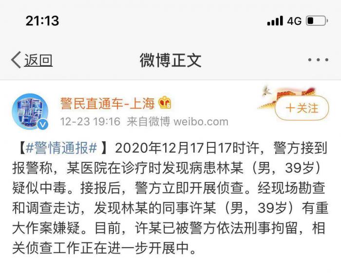 微博@警民直通车-上海发布通报,2020年12月17日17时许,警方接到报警称,某医院在诊疗时发现病患林某(男,39岁)疑似中毒。接报后,警方立即开展侦查。经现场勘查和调查走访,发现林某的同事许某(男,39岁)有重大作案嫌疑。目前,许某已被警方依法刑事拘留,相关侦查工作正在进一步开展中。