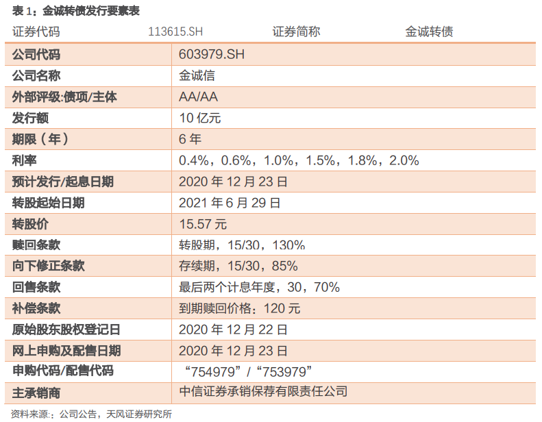 金诚转债规模适中,债底保护较好,平价略高、低于面值,市场或给予17%的溢价率,预计上市价格为116元。