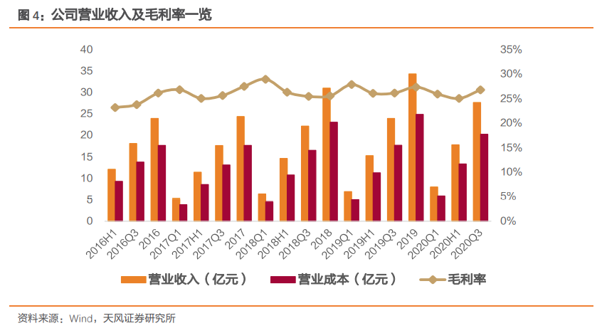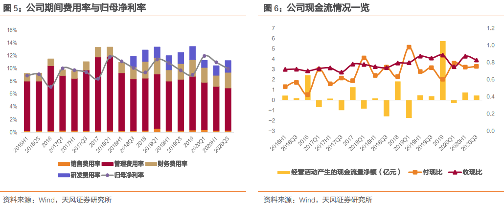 2020年前三季度,公司实现营业收入27.7亿元,同比增长15.55%,归母净利润2.76亿元,同比增长18.48%。费用方面,2020年前三季度,公司期间费用率11.25%,与2019年同期相比下降1.28个百分点,其中管理费用率6.64%,下降1.37个百分点,费用管控能力良好。同期,公司经营活动产生的现金流量净额为45.05亿元,同比增长17.98%;收现比0.83,下降0.02;付现比0.75,增长0.01,现金流情况优秀,收付现比较为稳定。截至 2020 年 3 月末,公司境内生产经营复工率已经达 95%左右,且2020年全年有望保持稳定盈利,体现了疫情冲击下的强韧性。