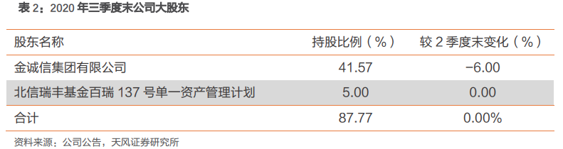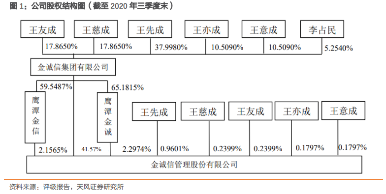 整体股权较为集中。截至2020年三季度末,公司前两大股东分别为金诚信集团有限公司,持股比例为41.57%;第二大股东为北信瑞丰基金百瑞137号单一资产管理计划,持股比例为5.00%;金诚信集团持有鹰潭金诚65.18%的股权、持有鹰潭金信59.55%的股权,金诚信集团与鹰潭金诚、鹰潭金信为一致行动人。王先成、王慈成、王友成、王意成、王亦成五名自然人系同胞兄弟合计持有金诚信集团94.75%股权,直接及间接持有公司合计49.50%的股份,为公司实际控制人。整体股权较为集中,不存在实际控制人风险。