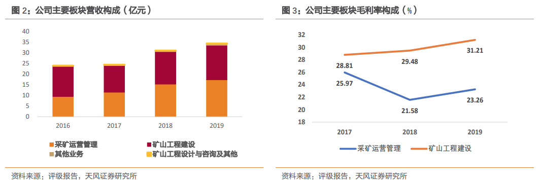 收入稳步增长,业务抗风险能力强劲。2019 年,公司主营业务收入占比超过 97%,主业突出。从主营业务构成看,2019年,公司采矿运营管理业务收入同比增长13.41%至17.32 亿元,主要系业务规模扩大所致。矿山工程建设业务增长 6.01%至16.17 亿元,主要系卡莫阿规模增加,万宝、金塞等新建项目结转综合所致。从毛利结构看,矿山工程建设业务毛利率(31.21%,FY19)高于采矿运营管理毛利率(23.26%,FY19),近年来两大业务毛利均有波动,但边际呈现上升趋势。