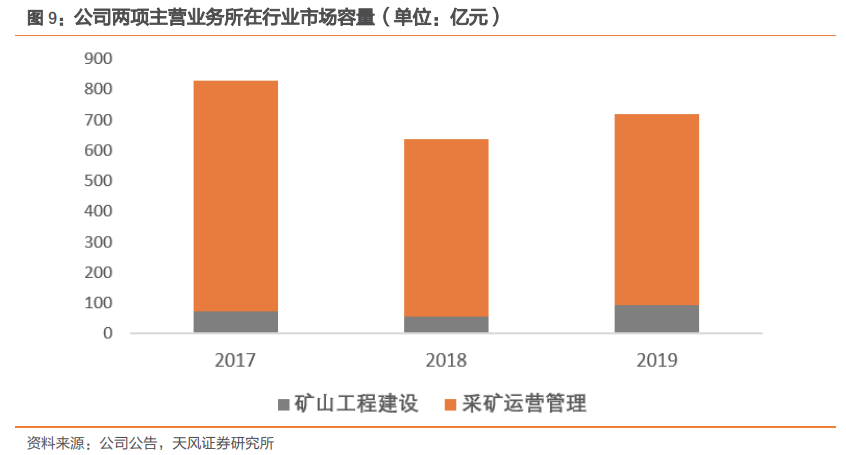 从公司主营的矿山工程业务和采矿运营管理两项业务的市场供求情况来看,需求端角度,在国内市场,矿山工程建设需由具备专业资质的服务商承担,已形成了较为成熟的市场体系,而采矿运营管理服务是近十几年才发展起来的新型运营模式,但由于其服务对象主要是已建成的矿山,业务持续性强。根据公司可转债募集说明书测算,2019年国内采矿运营管理和矿山工程建设市场容量约719.41亿元,其中采矿运营管理业务的国内市场容量约627.06亿元,矿山工程建设业务的国内市场容量约92.35亿元。供给端角度,在大中型矿山开发服务领域,由于开采周期较长、施工难度较大,对安全、环保要求较高,从而对矿山开发服务企业的资质、施工能力、人员素质、装备水平、行业经验、融资能力等有非常高的要求,市场进入门槛较高,故高端矿山开发服务商的数量短期不会大幅增加,而为数众多的小型服务商,受监管力度加大和市场竞争的淘汰,可能会呈逐步缩减的趋势。