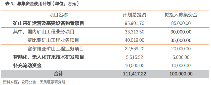 矿山采矿运营及基建设备购置项目方面:1)国内矿山工程业务项目主要目的要是为解决公司目前设备无法满足快速增长的业务量要求以及适应国家环保政策对采矿设备的升级改造要求,并推进合公司国内项目的在手订单及未来三年业务量规划情况。2)赞比亚矿山工程项目是拟以借款或增资形式提供给实施主体——金诚信矿业建设赞比亚有限公司,拟新增购置并报废更新等采掘工程施工设备。3)塞尔维亚矿山工程项目拟以借款或增资形式提供给实施主体——金诚信塞尔维亚矿山建设工程有限公司。公司于2019年进入塞尔维亚市场,目前主要为回风井及井下中段开拓采切工程施工,后续将开始采矿,公司预计在塞尔维亚市场业务量快速增长。
