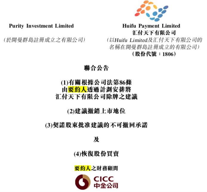 12月23日早上,港交所官网显示,汇付天下(股份代号:01806)发布重磅公告,要约人及本公司联合宣布,于2020年12月22日,要约人要求董事会,就根据公司法第86条透过计划安排将本公司除牌,向计划股东提呈一项建议。建议完成后,本公司将成为要约人的全资附属公司及股份将在联交所撤回上市地位。要约人之财务顾问是中金公司。
