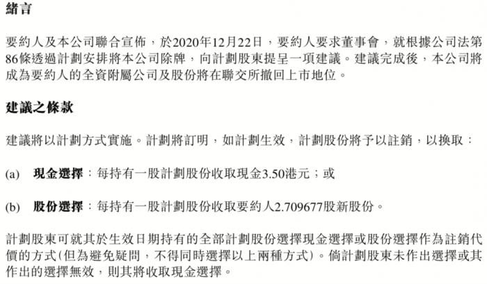 建议将以计划方式实施。计划将订明,如计划生效,计划股份将予以注销,以换取:(a)现金选择:每持有一股计划股份收取现金3.50港元;或(b)股份选择:每持有一股计划股份收取要约人2.709677股新股份。