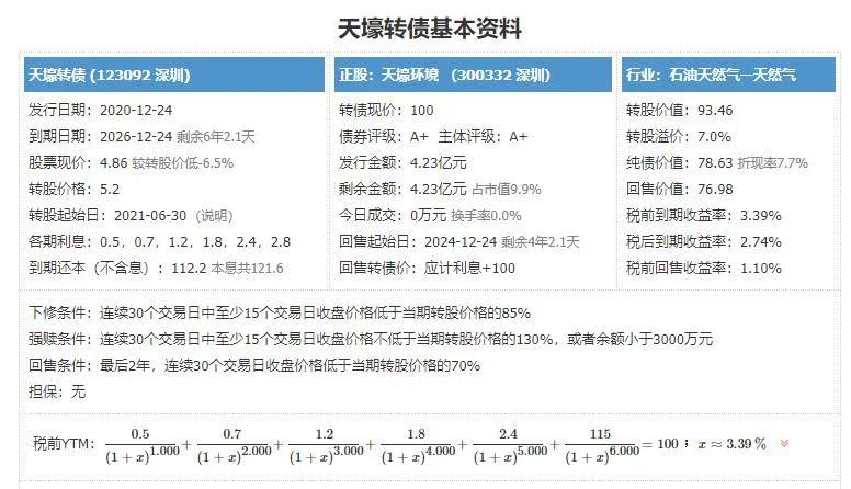 基本信息:A+,6年期,转股溢价7%,每张持有到期本息为121.6元(税后本息为117.28元)。发行规模4.23亿元,每股配售0.4805元,最低209股可配售一张,股权登记日为12月23日。
