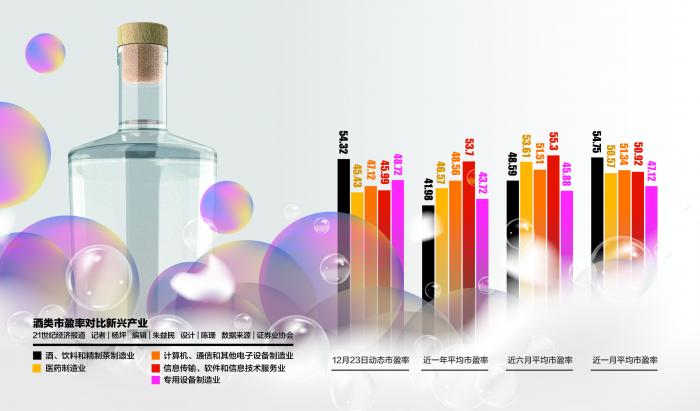 截至12月23日,酒、饮料和精制茶制造业54.32倍的平均动态市盈率,高于医药制造行业的45.43倍,计算机、通信和其他电子设备制造业的47.12倍,信息传输、软件和信息技术服务业的45.99倍,科学研究和技术服务业的51.58倍。