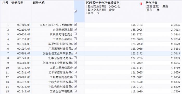 根据同花顺iFinD统计,截至12月23日,有51只偏股型基金的收益翻倍。目前位居2020年基金业绩冠亚季军的基金均被农银汇理基金经理赵诣所管理的3只基金揽入囊中,分别为农银汇理工业4.0、农银汇理新能源主题、农银汇理研究精选,收益率分别达到156.97%、155.2%、146.2%。