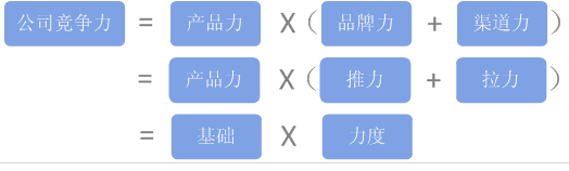 食品饮料行业面向数量庞大的消费者提供产品。对消费者而言:产品是基础,品牌是拉力,渠道是推力。对于行业内公司的竞争力,可以使用以下公式进行分析: