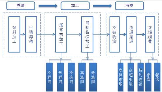 屠宰及肉类加工行业上下游相关产业链很长,屠宰及肉类加工行业属于产业链的中下游行业;其上游主要有种植业、饲料行业、生猪养殖;其下游主要为消费者。