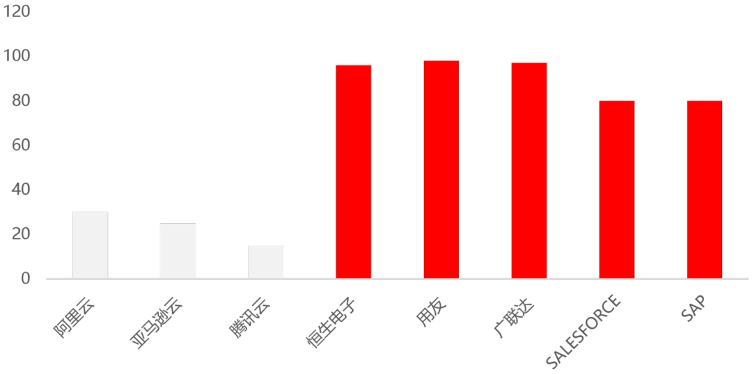 我们搜集和估算了全球主要IAAS及SAAS厂商相应产品的毛利率,发现SAAS厂商普遍要比IAAS厂商的毛利率要更高。其中国内典型的三家SAAS公司,用友、恒生电子、广联达的产品毛利率都在95%以上,而国外的SAAS龙头SALESFORCE和SAP的产品毛利率在80%左右。IAAS方面,国内的阿里、腾讯IAAS产品据估算分别是30%、15%,而全球领先的IAAS龙头亚马逊云的产品毛利率也仅为25%。
