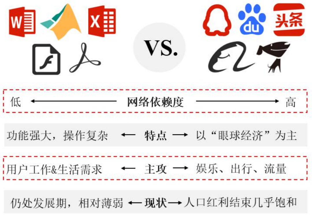 这类软件和国内常见的消费互联网应用相比,一般具有功能强大、操作多样复杂的特性,用户可以借助软件实现一些复杂的功能,完成复杂的任务。这些软件发展之初往往是单机软件,其核心功能的实现对网络依赖度很低,这些特征和消费互联网应用的区别十分明显。
