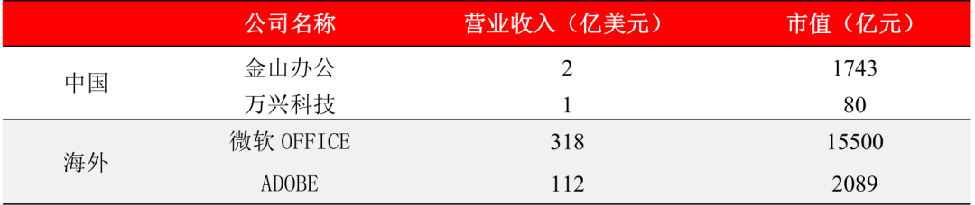 从营收角度看,国内C端应用软件公司和国际先进水平的差距则更大。尽管经历了近年的快速增长,金山办公2019年的收入依然只有2.3亿美元,不到微软OFFICE单项收入317.7亿美元的1%,仅为ADOBE公司112.1亿美元的2%。修补辅助类软件的收入则更低,龙头企业万兴科技2019年的营收只有1亿美元。