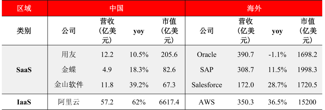 与此相对应的,就是国内企业信息化软件公司相比国际巨头,极其弱小。以国内企业服务领域相对规模较大的用友和金蝶为例,其2019年营收分别为12.2、4.9亿美元。而国际领先的对标公司营收都超过百亿美元,如SAP以及Salesforce2019年的营收分别达到308.7、172.0亿美元。更为可怕的是,Salesforce在如此高基数的前提下,2019年的营收增速依然达到了28.7%,大幅高过低基数的用友以及金蝶。