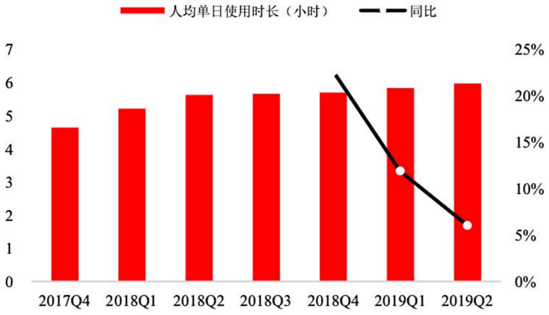 虽然国内的消费互联网依然在向纵深发展,但用户的使用时长已经接近了理论的极限。QuestMobile的数据显示,2019年二季度,国内移动互联网月活数达到11.36亿,连续三个季度没有增长;用户时长达到5.97小时/天,相比2018年同期增加仅仅0.3小时。考虑到国内总人数14亿,工作日只有8小时的闲暇时间,我们认为,国内当前的用户时长或已见顶,未来增长空间非常有限。