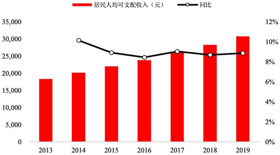 国内企业过去信息化程度低,一个很重要的原因是用工成本低,通过信息化提升效率降低人工成本的需求并不迫切。但近年来,全国居民人均可支配收入快速提升,从2013年的1.8万元增加到了2019年的3.1万元,超出GDP增速。同时十九大报告提出到2035年,“人民生活更为宽裕,中等收入群体比例明显提高,城乡区域发展差距和居民生活水平差距显著缩小”,未来居民的可支配收入依然会保持较快提升速度。