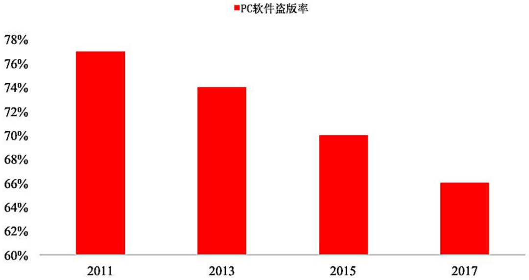 BSA(商业软件联盟)公布的数据显示,过去几年,中国是世界上盗版率下降最快的国家, 2011年到2017年间,中国的盗版率由77%下降到66%,下降了11%。