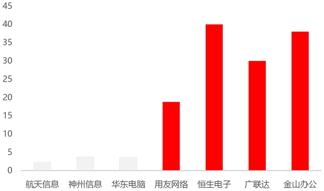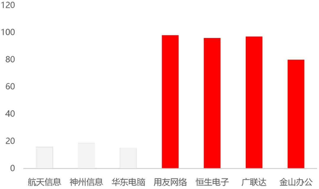国内软件企业众多,但大部分企业开发的是项目化软件,能真正形成软件产品化的企业相对较少。我们统计了A股的计算机企业,发现其中以软件为主要业务的大约有170家,而其中具备较成熟软件产品的公司只有40多家,可见即便在上市公司层面,产品类软件公司的占比也只有20%。